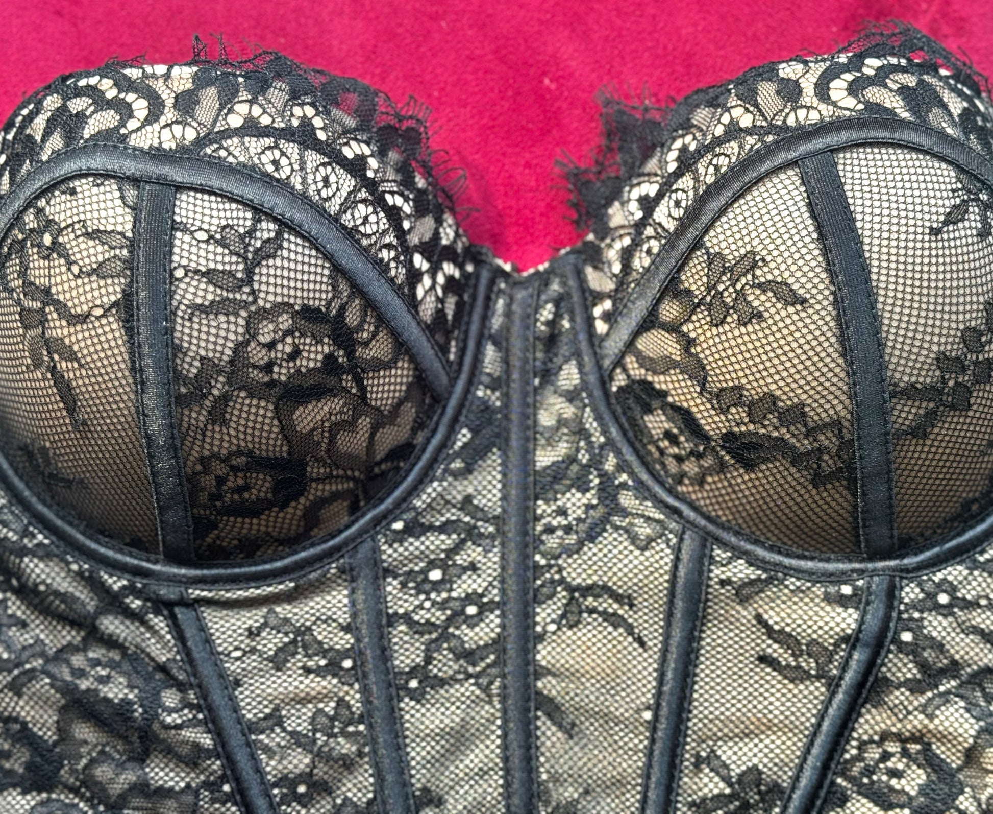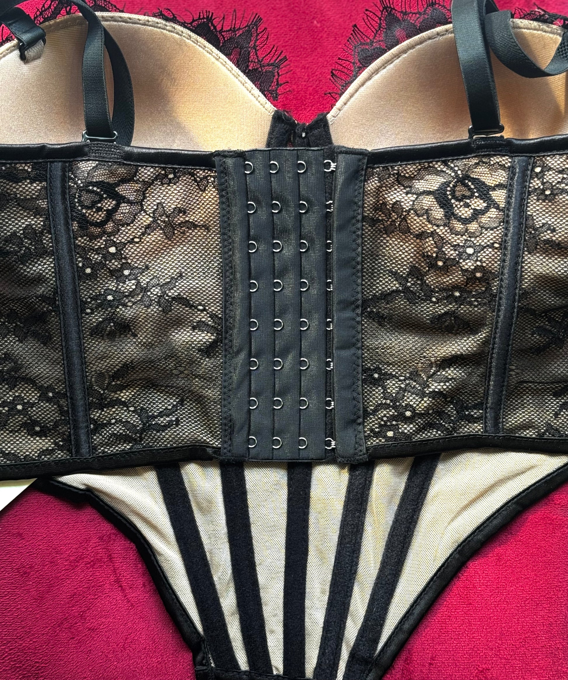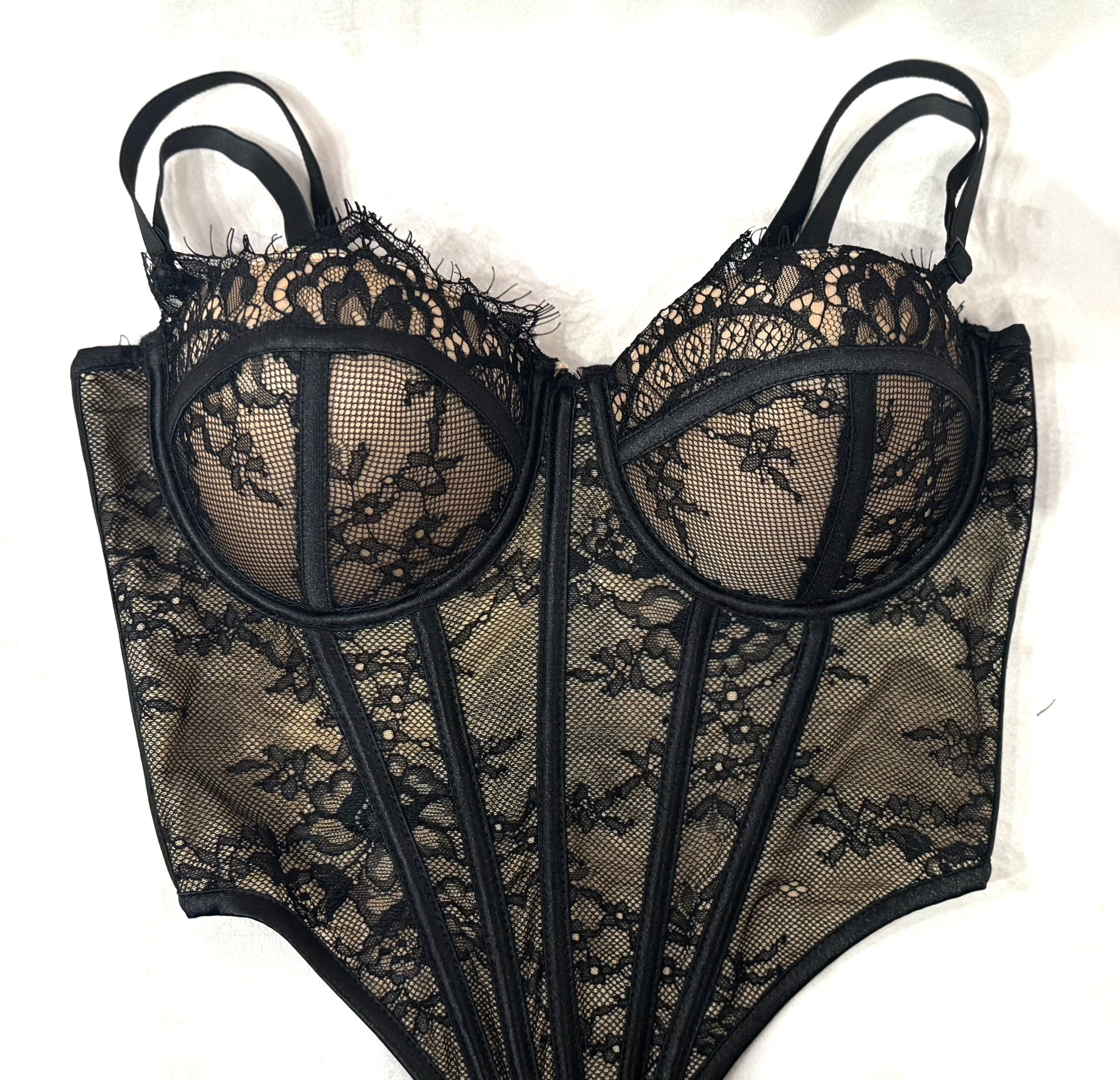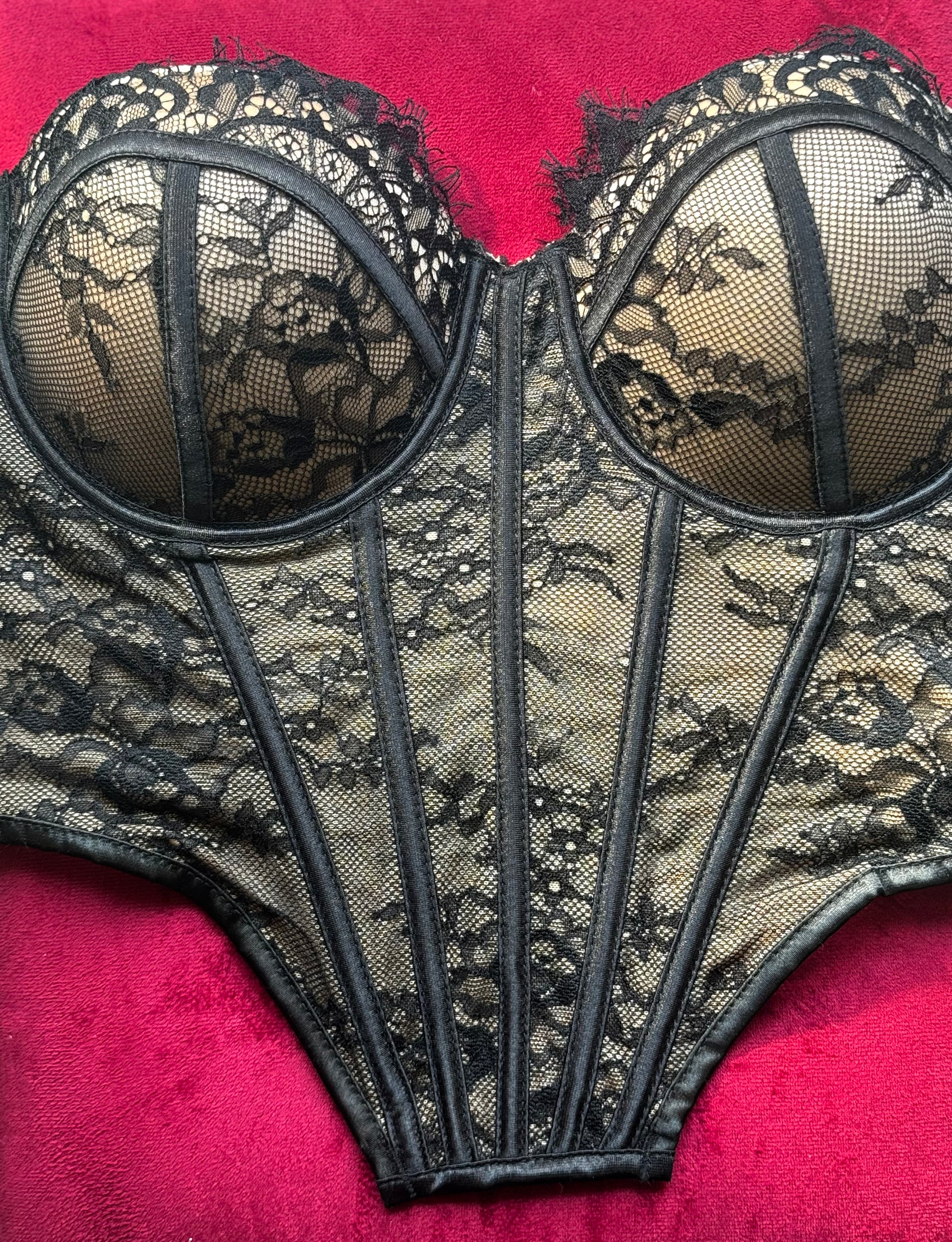 Bustino realizzato in pizzo delicato seta, con dettagli intricati e una chiusura posteriore a laccio, disponibili in diverse taglia e colori