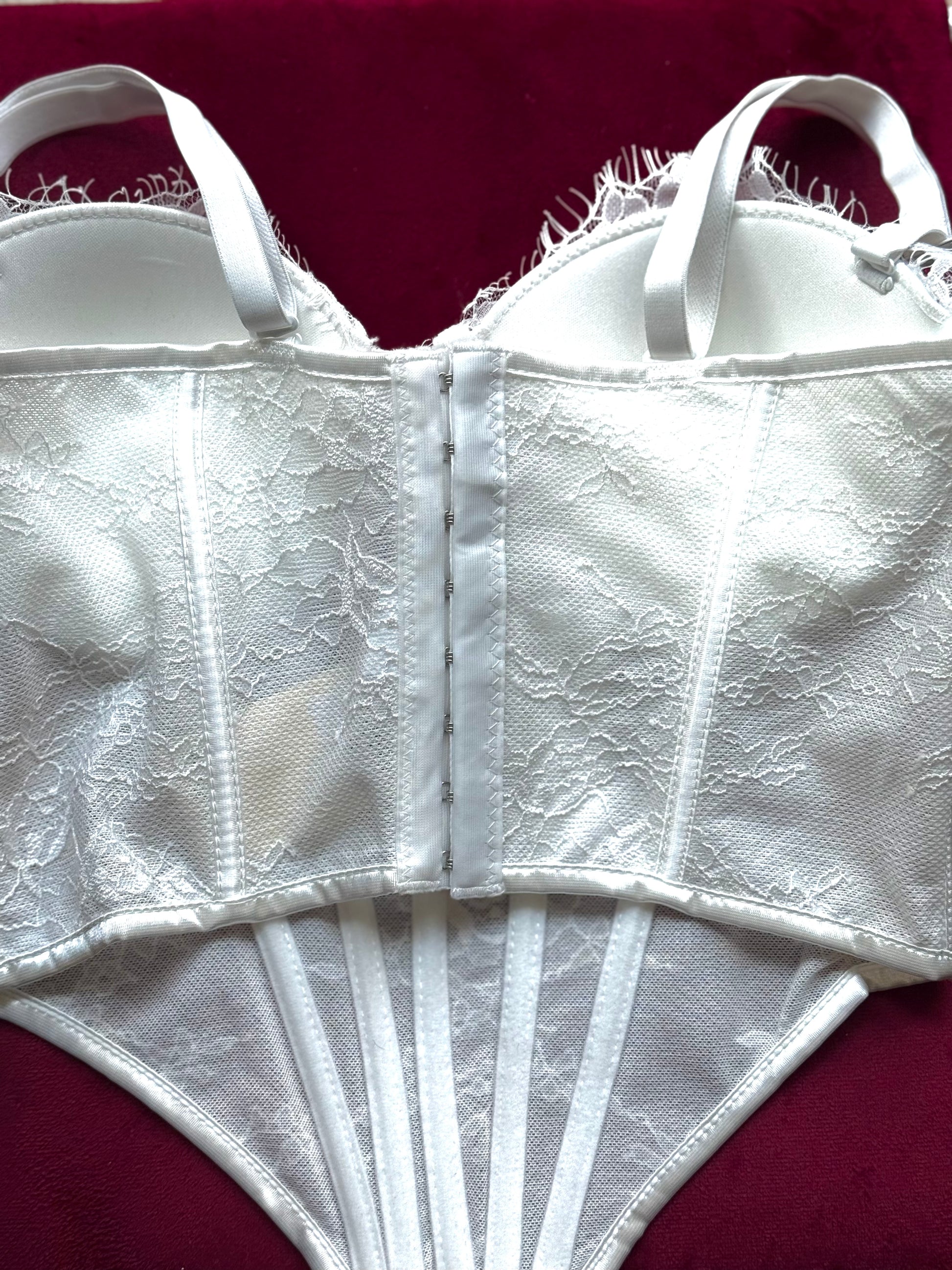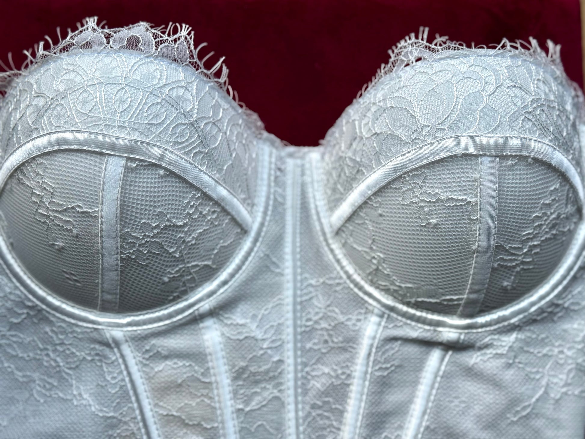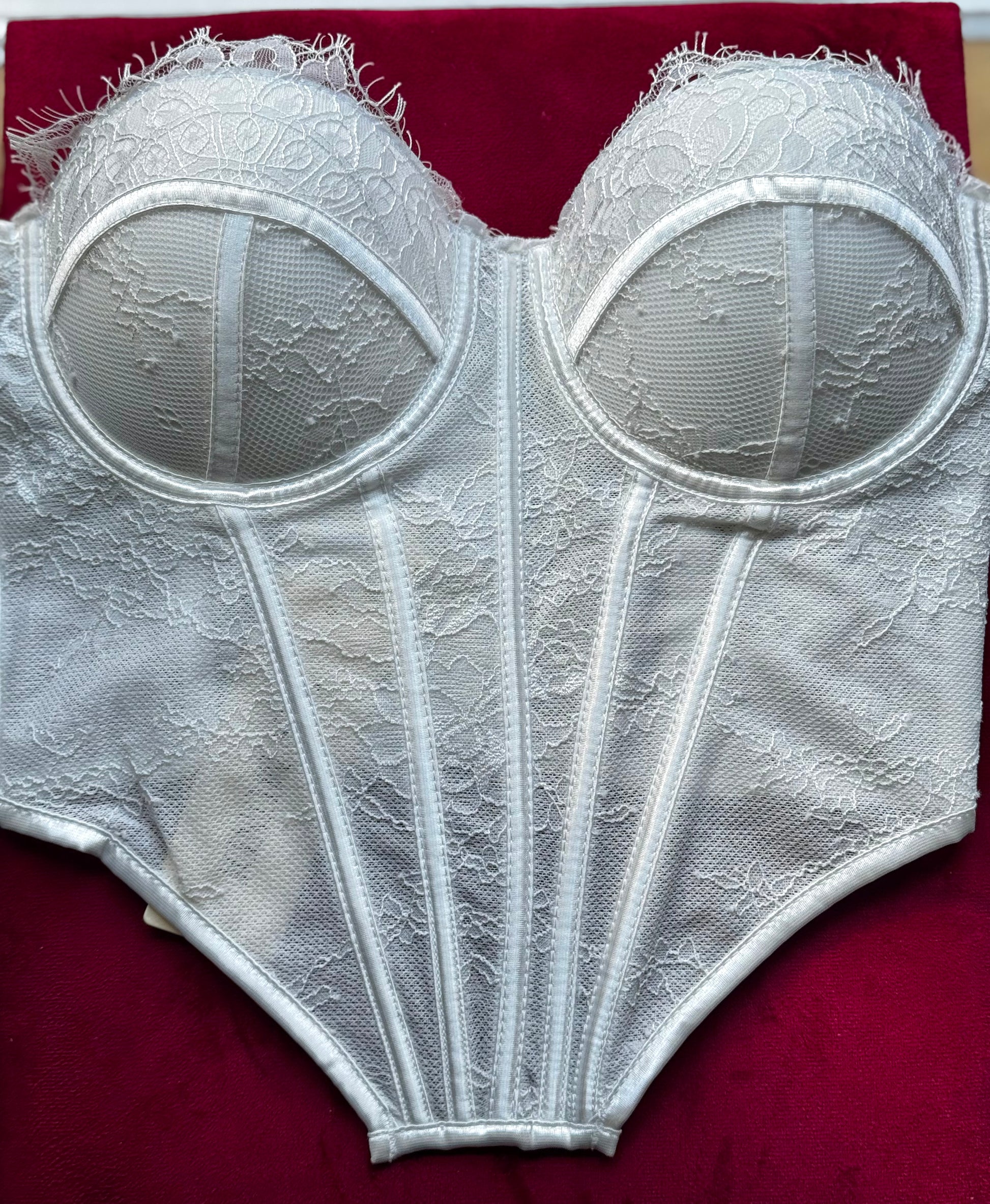 Bustino realizzato in pizzo delicato seta, con dettagli intricati e una chiusura posteriore a laccio, disponibili in diverse taglia e colori